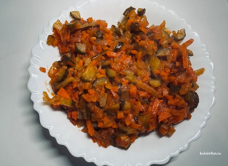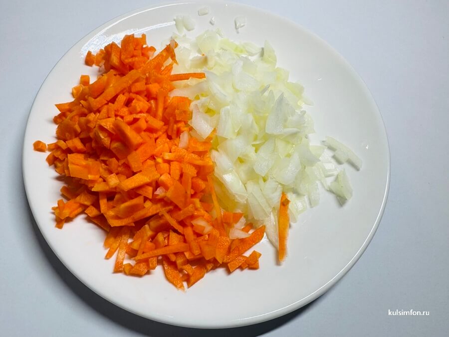 - Делаем зажарку. В сковороде с растительным маслом обжарьте лук и морковь до мягкости. Добавьте томатную пасту, перемешайте и готовьте 2–3 минуты.