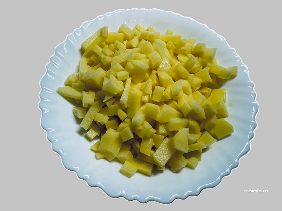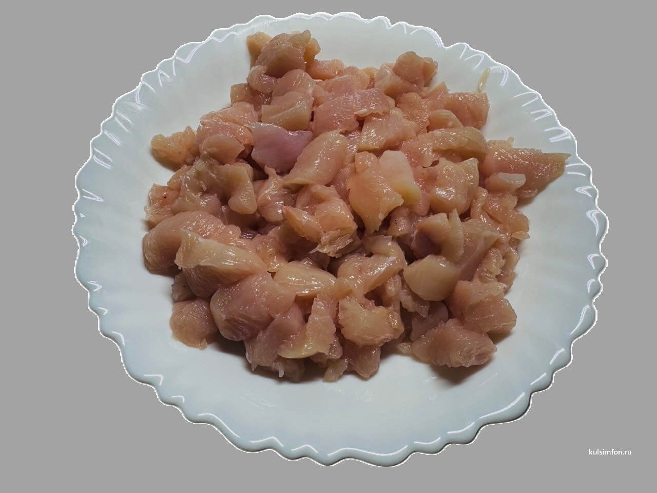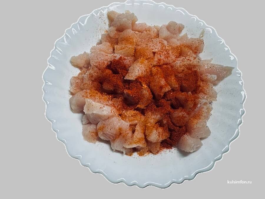 - Куриное филе нарежьте кубиками, посолите, поперчите и посыпьте копченой паприкой. Оставьте на 15–20 минут.