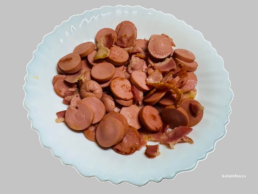 - Если используете бекон — сначала обжарьте его до вытопления жира, затем на этом же жире подрумяньте нарезанные кружочками сосиски до легкой корочки. Если бекона нет, обжарьте сосиски просто на сухой сковороде.