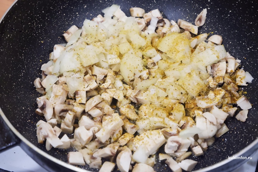 - Грибы вымыть и нарезать небольшими кубиками. Лук очистить и мелко нарезать. Обжарить грибы с луком, специями и солью до готовности.