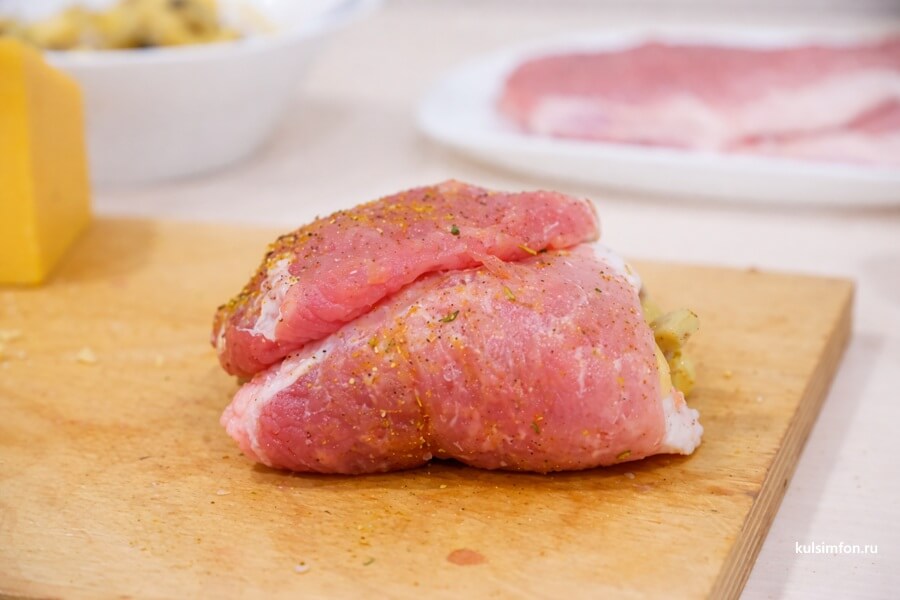 - Сыр натереть на крупной терке и смешать с остывшими грибами и луком. Свинину нарезать порционными кусочками и отбить кухонным молоточком. Посолить и приправить с обеих сторон.