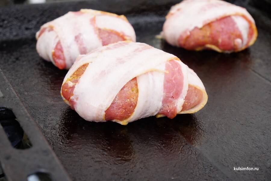 Свиные рулетики в беконе с грибами: рецепт по шагам
