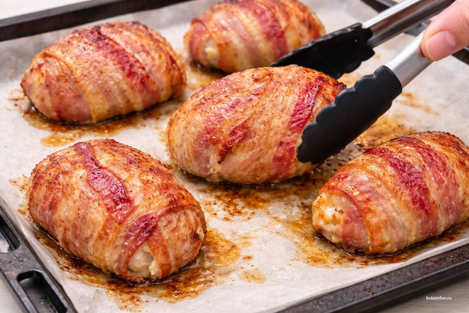 - Каждый рулетик обернуть двумя ломтиками бекона и выложить на противень. Запекать в разогретой до 170 градусов духовке около 30 минут до румяной корочки.