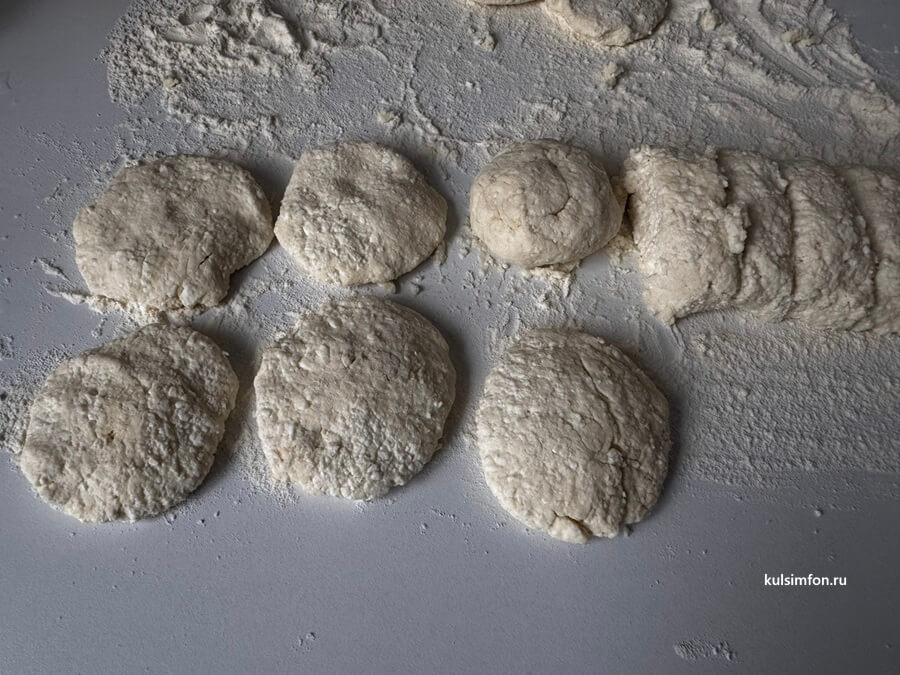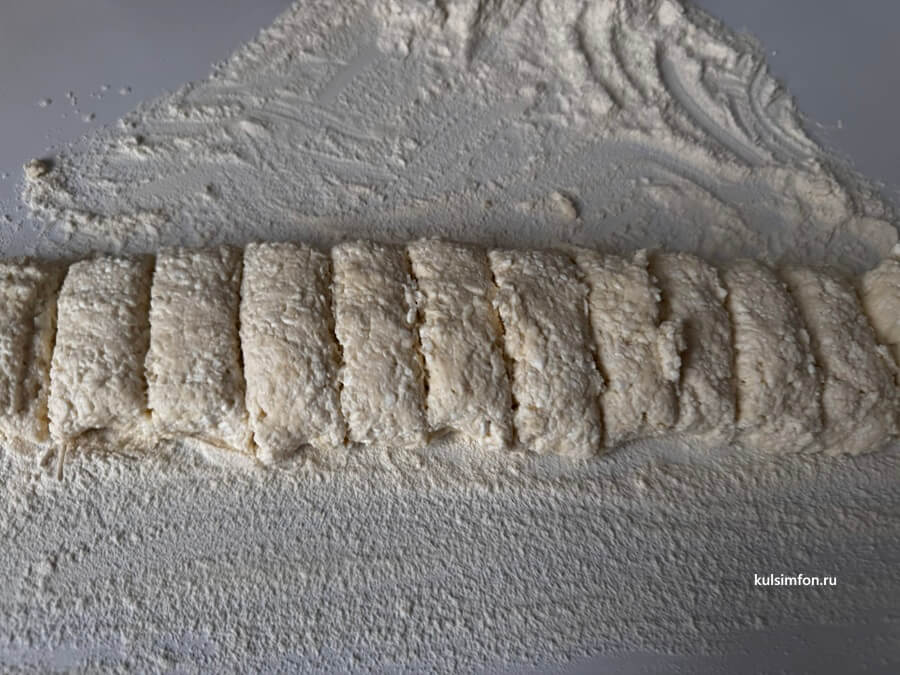 - Рабочую поверхность слегка присыпьте мукой. Из теста сформируйте колбаску и нарежьте ее на равные кусочки.