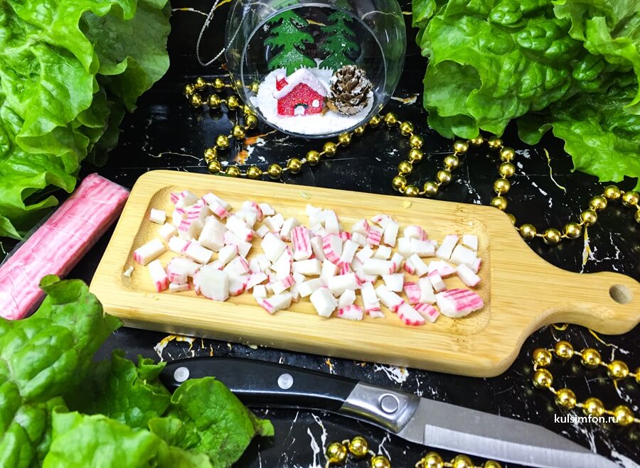 - Очищаем крабовые палочки от упаковки и нарезаем мелкими кубиками.