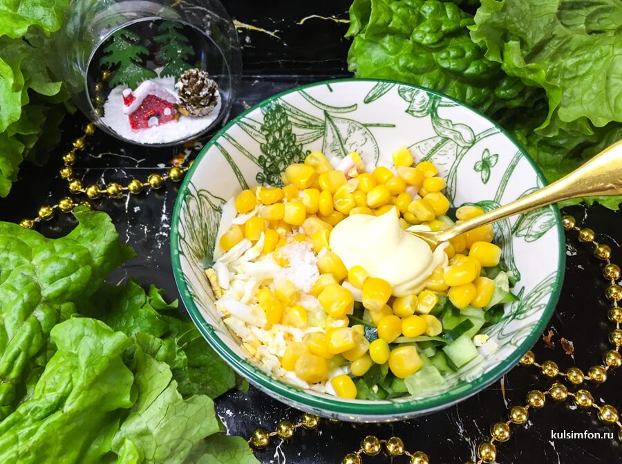 - Огуречной овощечисткой делаем тонкие длинные ленты, скручиваем их в розочку и помещаем сверху. Можно просто посыпать дополнительными зернами кукурузы.