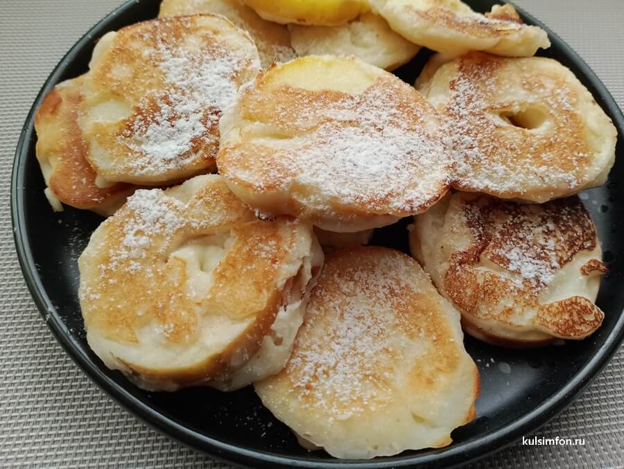 - Готовые яблочные кольца напоминают мини-оладьи с нежной фруктовой начинкой. Подавать их можно теплыми с медом, йогуртом или сметаной.