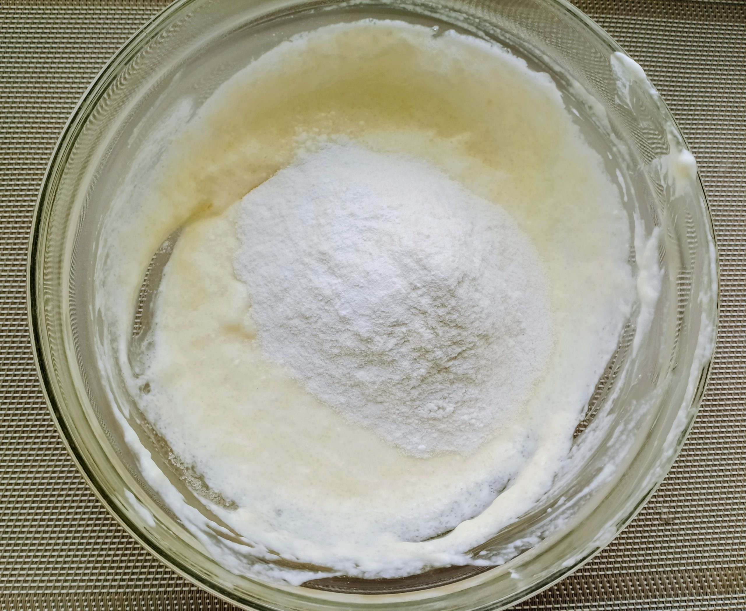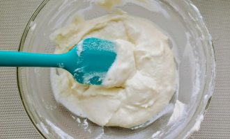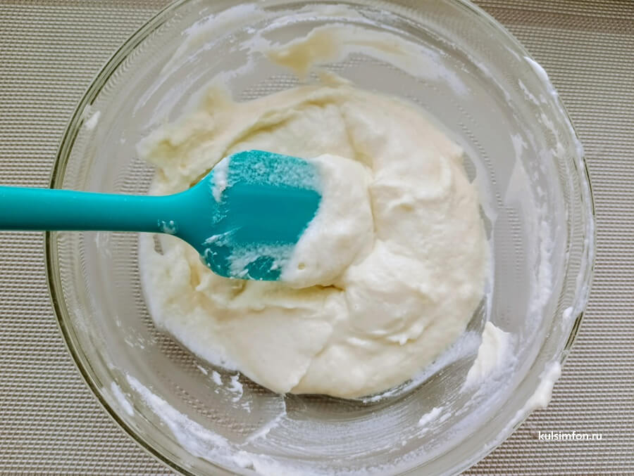 - Всыпать рисовую муку и разрыхлитель, снова тщательно перемешать — тесто должно получиться как густая сметана.