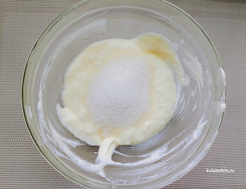 - Добавить сахар, перемешать, чтобы масса стала гладкой.