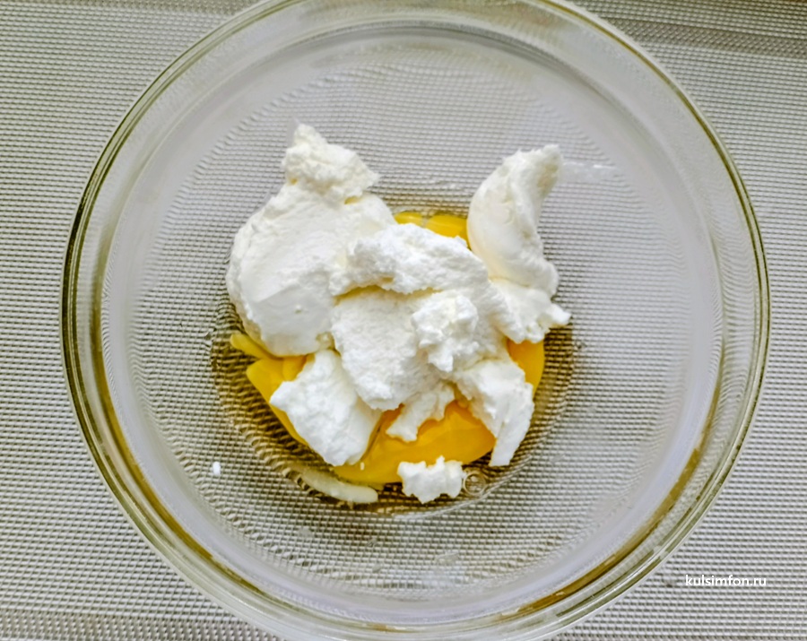 - В миске соединить яйцо и мягкий творог, растереть до однородности.