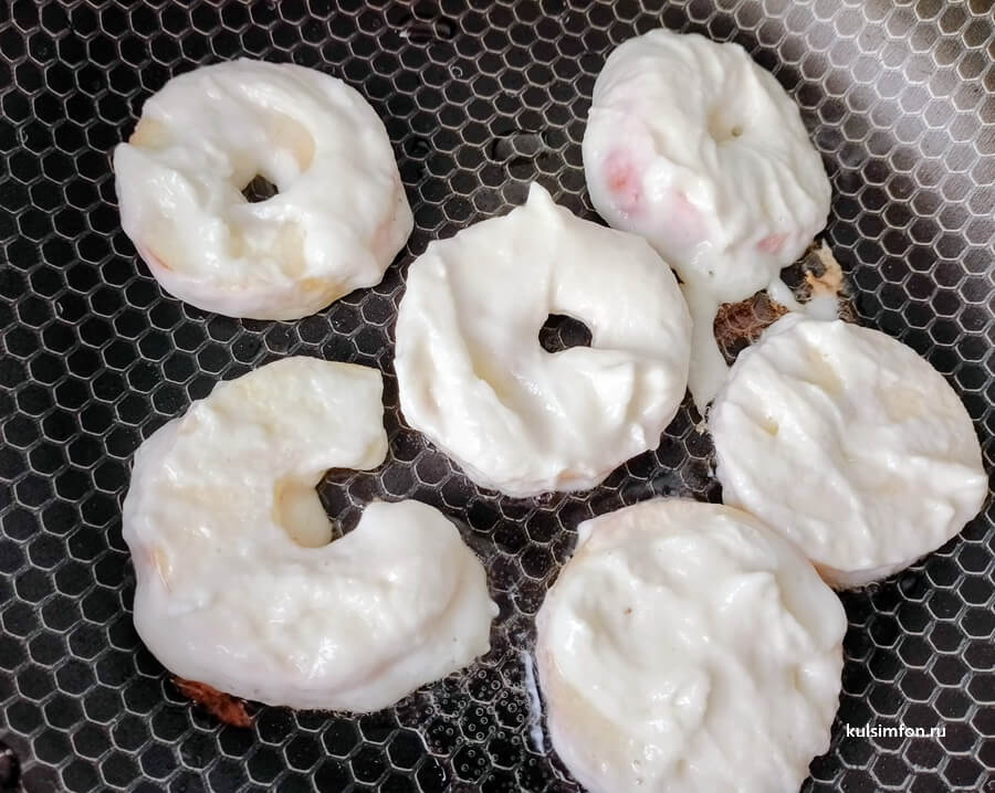 - Разогреть сковороду с небольшим количеством масла. Окунуть каждое яблочное кольцо в тесто и выложить на сковороду.