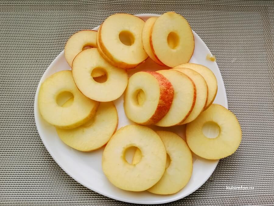 - Яблоки вымыть, очистить при необходимости, удалить сердцевину и нарезать кольцами толщиной около 0,5–0,7 см.