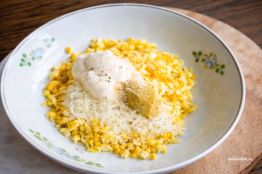 - Добавьте к яйцам майонез, горчицу и натертый сыр. Перемешайте массу ложкой до однородности. Посолите и поперчите по вкусу.