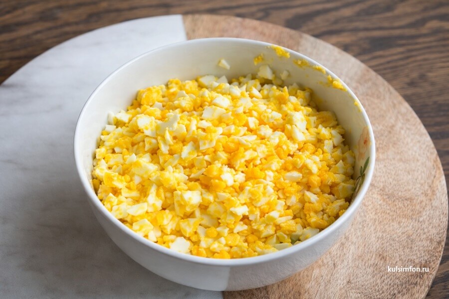 - Когда яйца остынут, очистите их и мелко нарежьте или натрите на крупной терке.