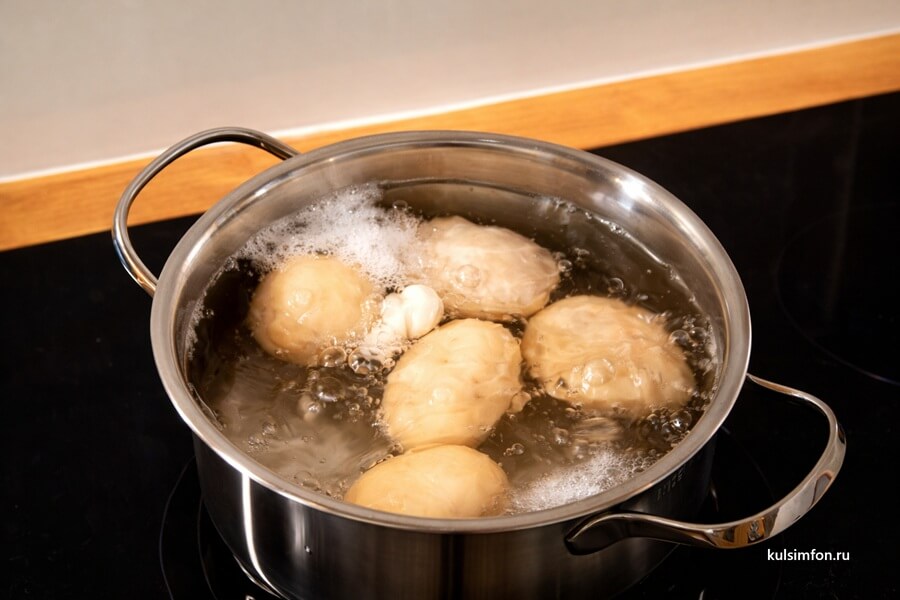 - Положите 5 яиц в подсоленную воду и варите 8–10 минут после закипания. Затем слейте кипяток и залейте яйца холодной водой, чтобы они легче очищались.