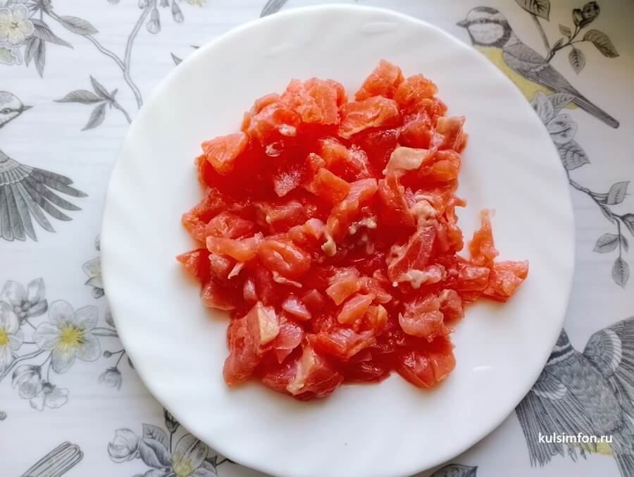 - Огурец очистите от кожуры и нарежьте мелким кубиком.
