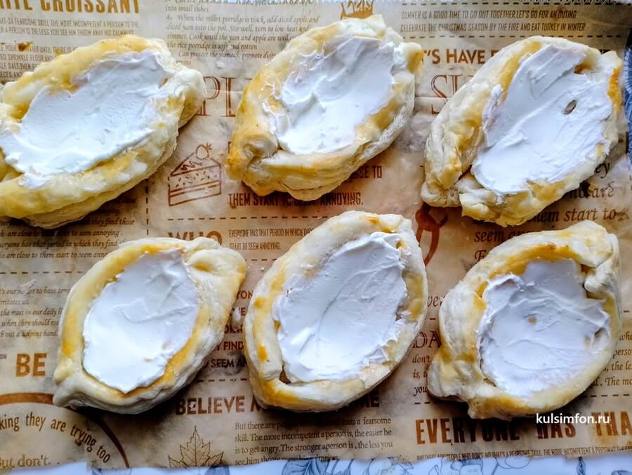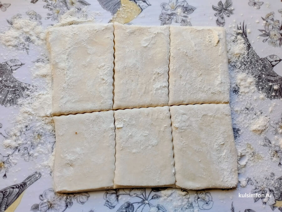 - Слоеное тесто слегка раскатайте и разрежьте на 6 прямоугольников.