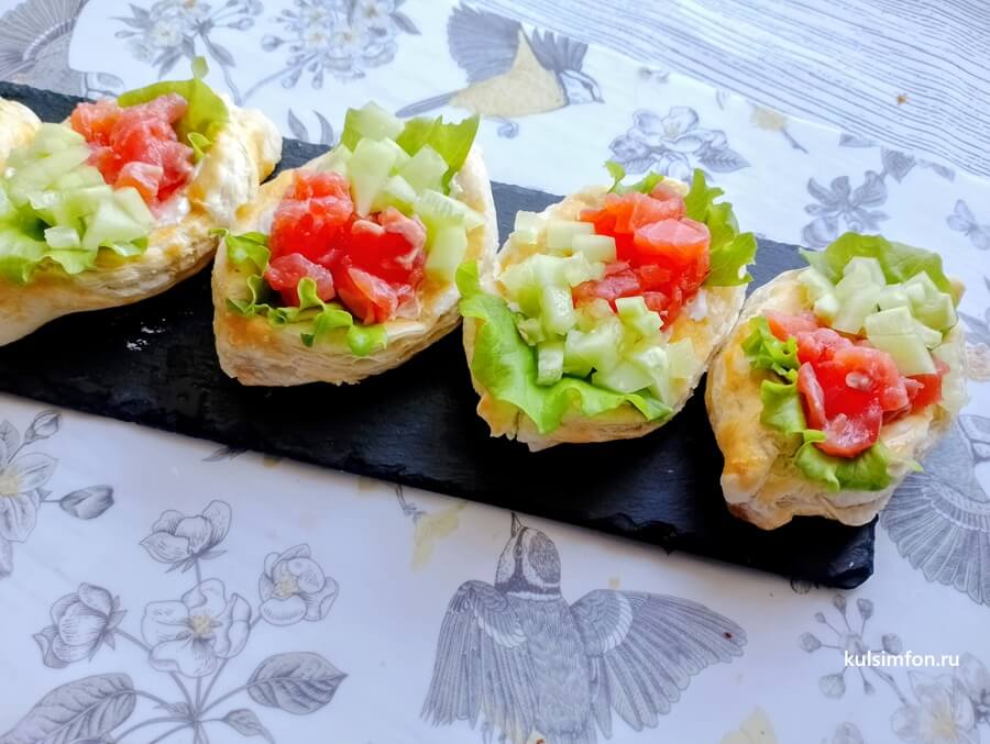 Закуска из слоеного теста с красной рыбой подходит для праздничного и повседневного стола. Она готовится быстро и не требует сложной подготовки. Хрустящие лодочки из слоеного теста с мягким творожным сыром, слабосоленой рыбой и свежим огурцом выглядят аккуратно и обладают легким, сбалансированным вкусом.