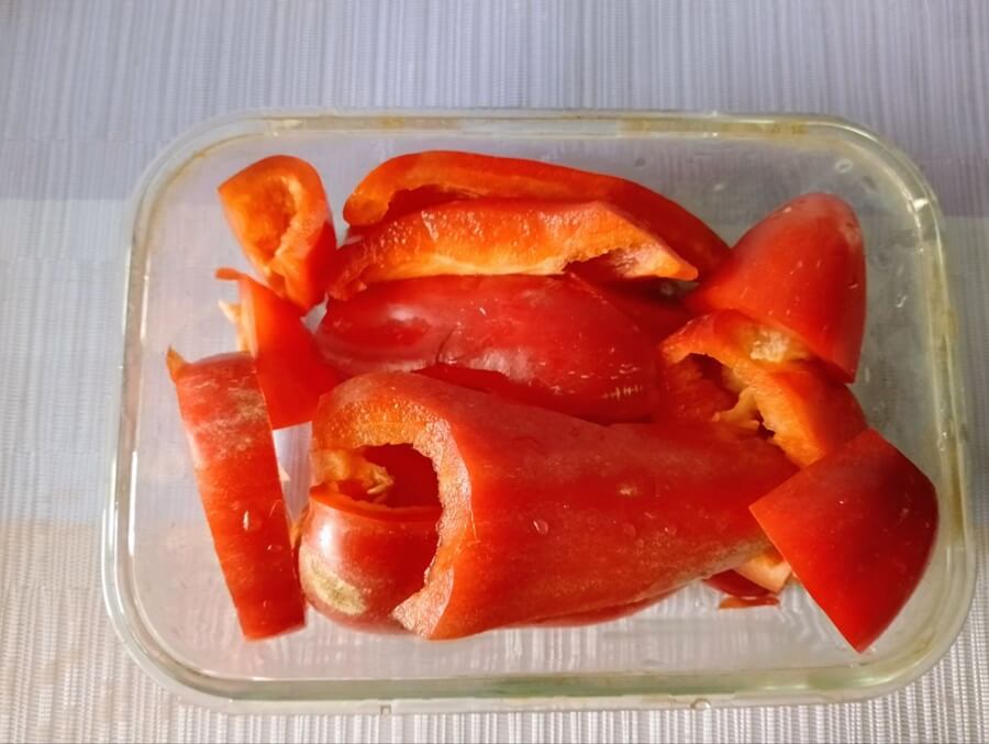 - Вымойте перцы, срежьте верхушки и удалите семена. Нарежьте на крупные кусочки, выложите в форму, накройте фольгой и запекайте 20–30 минут при 180 °C.