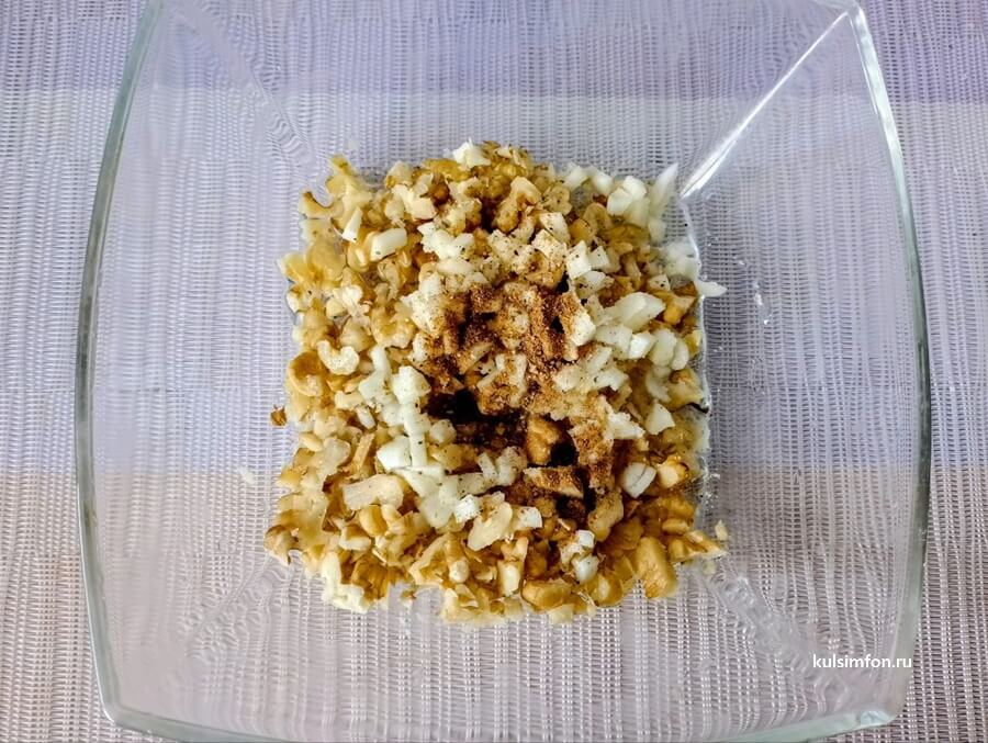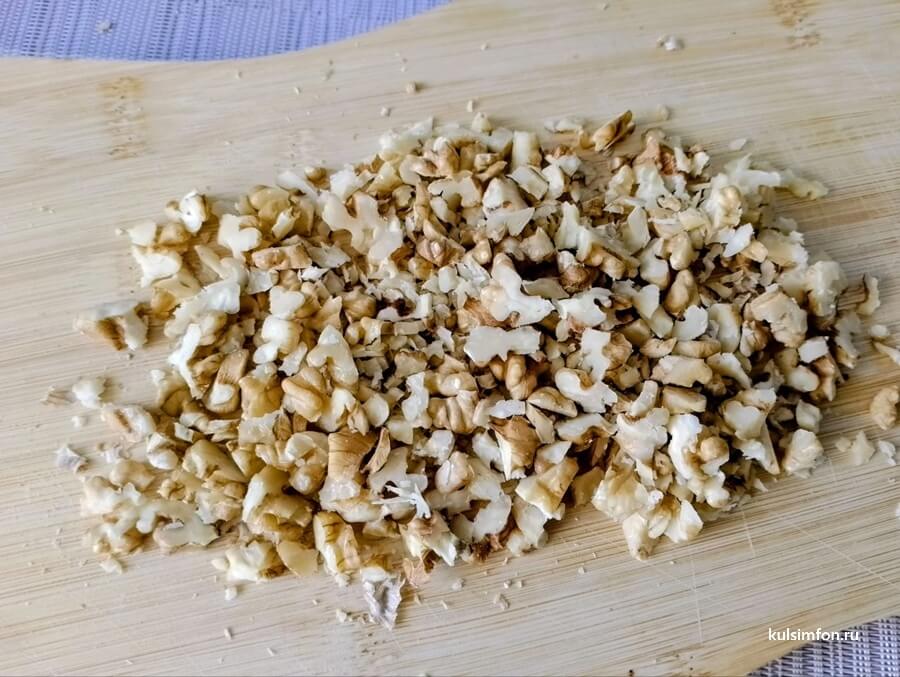 - Пока перцы запекаются, измельчите грецкие орехи.