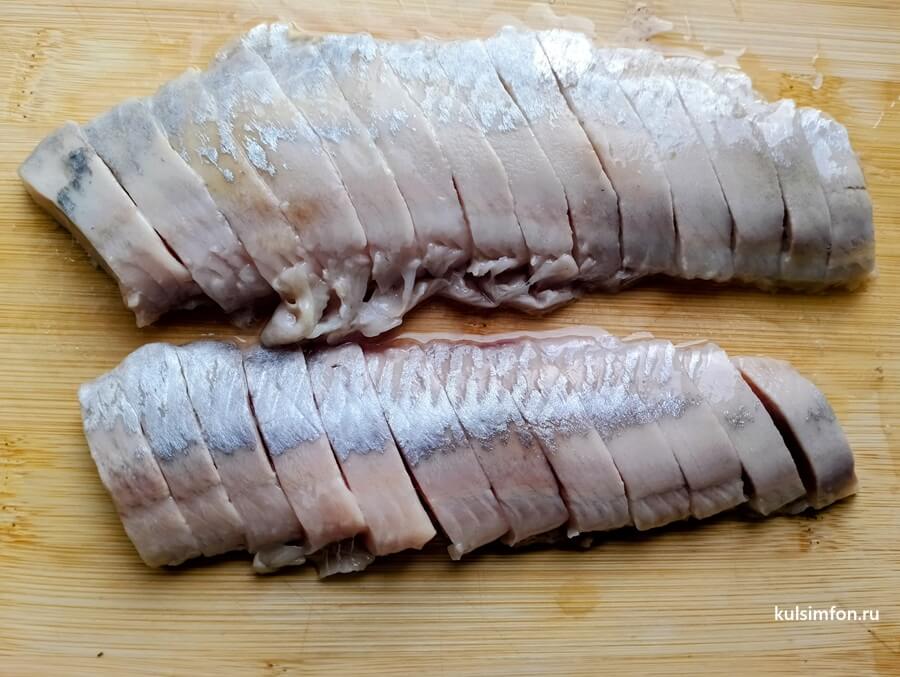 - Филе сельди нарезать кусочками толщиной около 1 см.
