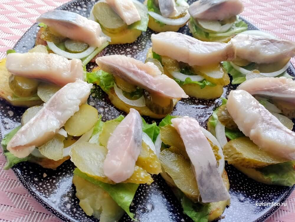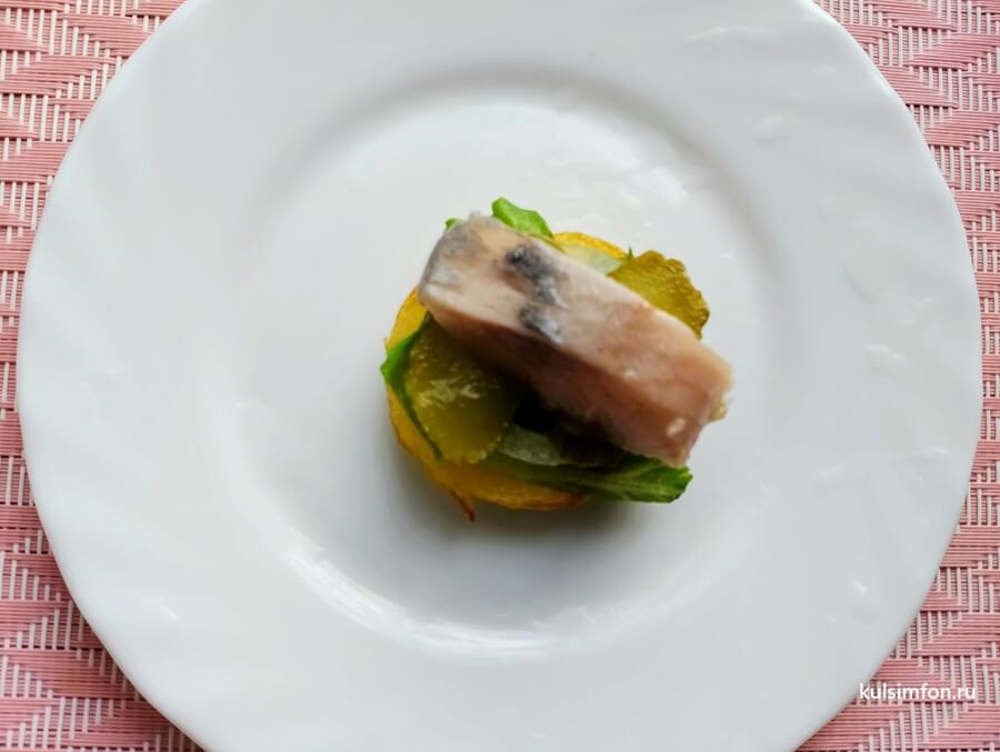 - Завершить закуску кусочком сельди.