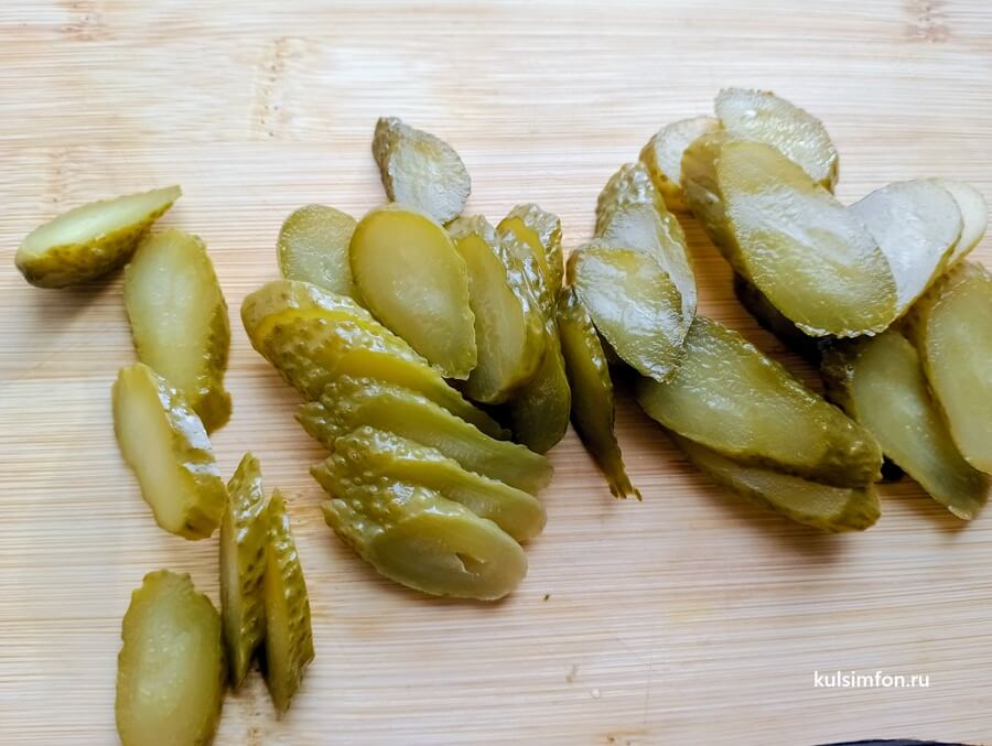 - Маринованные огурцы нарезать тонкими кружками.