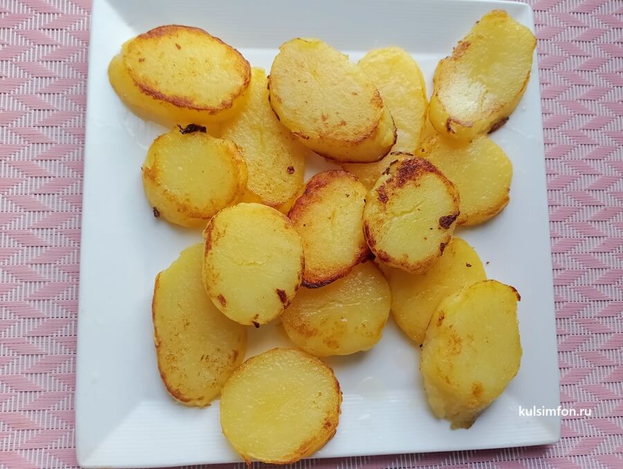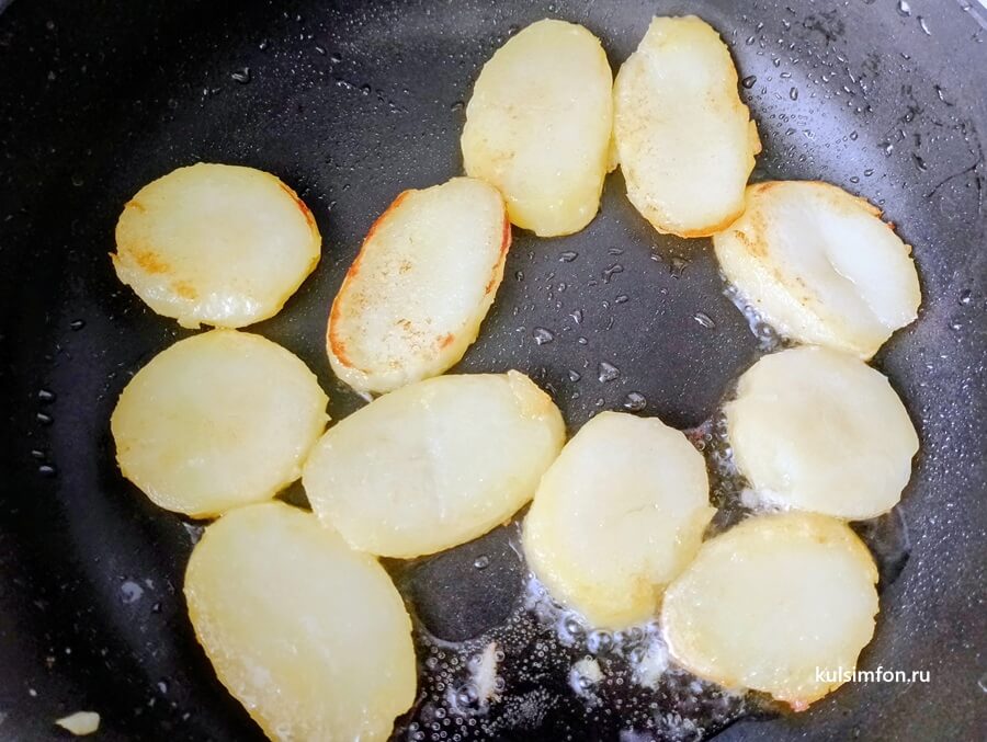 - Быстро обжарить картофельные ломтики на растительном масле с обеих сторон до легкой золотистой корочки.