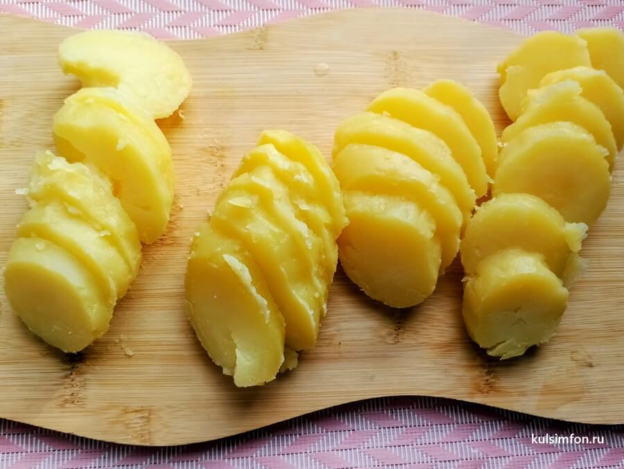 - Картофель отварить в мундире до готовности, остудить и нарезать кружками толщиной около 0,5 см.