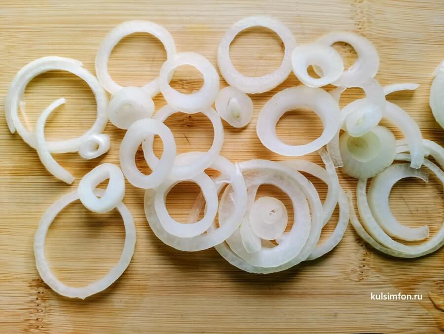 - Лук очистить и нарезать кольцами.
