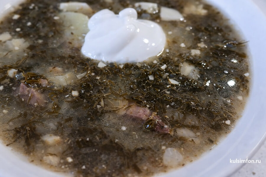 - Щавелевый суп очень ароматный и аппетитный. Лучше всего подавать со сметаной, она никогда не лишняя в этом блюде. Мясо разобранное на кусочки накладывается в готовый суп порционно.